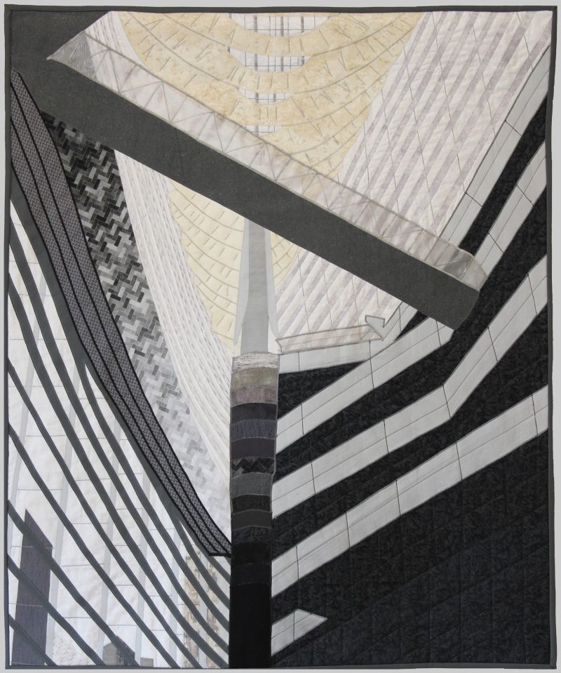 My art quilts are usually designed from my own photographs, which are often of places, particularly buildings, with which I have special connections and which have left a lasting impression on me. This particular building in Tokyo did just that. Though the architect, Rafael Viñoly is not Japanese (he is Uruguayan-American), he managed to capture both the simple elegance of the Japanese aesthetic and the structural integrity of a building meant to serve real people in a dense urban environment.  I was so struck by this building when I was there, so moved by the experience of being it in, and so uplifted by the sheer beauty of the design, that I have never forgotten it. Nor have I ever abandoned a desire to capture this image in an art quilt.