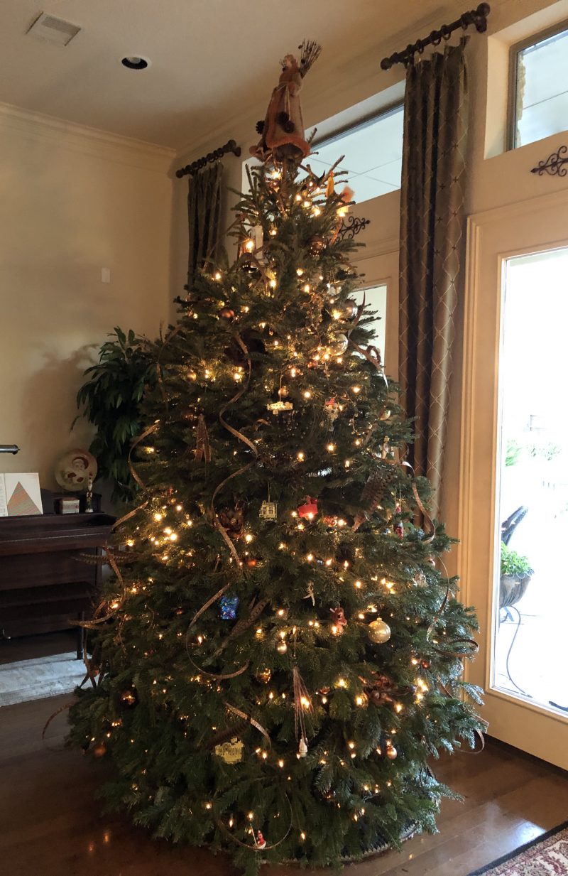 We discovered Nordmann firs here in San Antonio and, once again, we have a high ceiling which can accommodate a tall tree. Everything was fine until about five years ago when we got the tree stuck in the doorway and had to call a neighbor to help us get it in and up. Since we are still putting up a tall tree, we have had to enlist the help of our son. He doesn’t mind, bless him, but the time may be coming, as it did with the sugarplum decorations and a second indoor tree, to say “Enough.”
