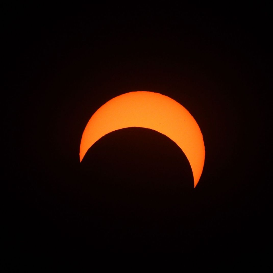The October eclipse was what is called an “annular” eclipse, which means that the moon is closer than its maximum distance from the earth so that its shadow is not quite large enough to completely cover the sun during the eclipse. Our view did not reveal the so-called “ring of fire,” but more of a ring of bright white (which explains why I chose the more dramatic photo of the partial passing above for this post). Nor did the annular eclipse create a total darkness at 11:54 a.m., but rather a glowing dimness more akin to dusk.